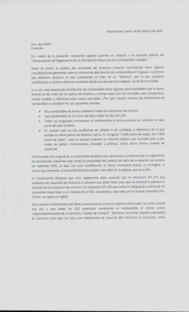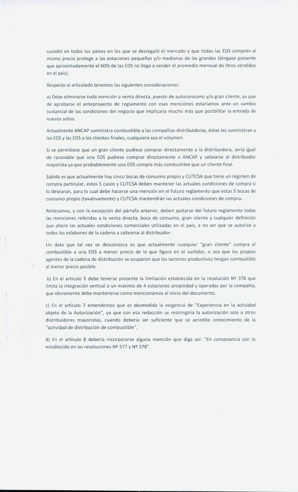 La Unión de Vendedores de Nafta del Uruguay realiza sus aportes al "Anteproyecto del Reglamento de la Distribución Mayorista de Combustibles Líquidos.-